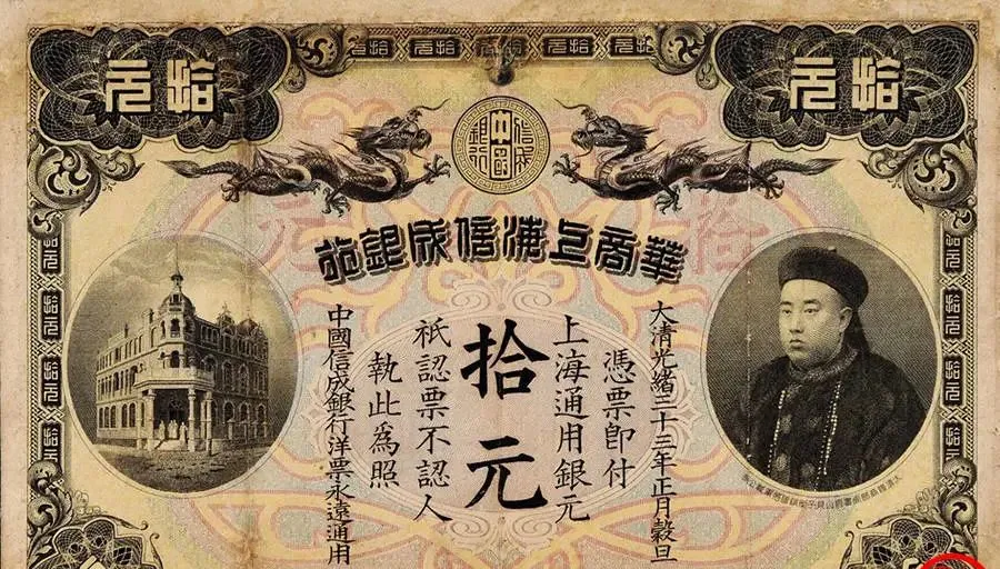 这个花团龙纹的纸面叫信成银行钞票,右侧椭圆框里就是载振的头像,印钞这回事儿,既讲门第也讲场合,按理说把部里的尚书头像印上去,能说得过去,真正的门道呢,老爷子那会儿位高权重,下面的人巴结有路,把人像抬到钱上,也算留了个脸面在坊间流传。