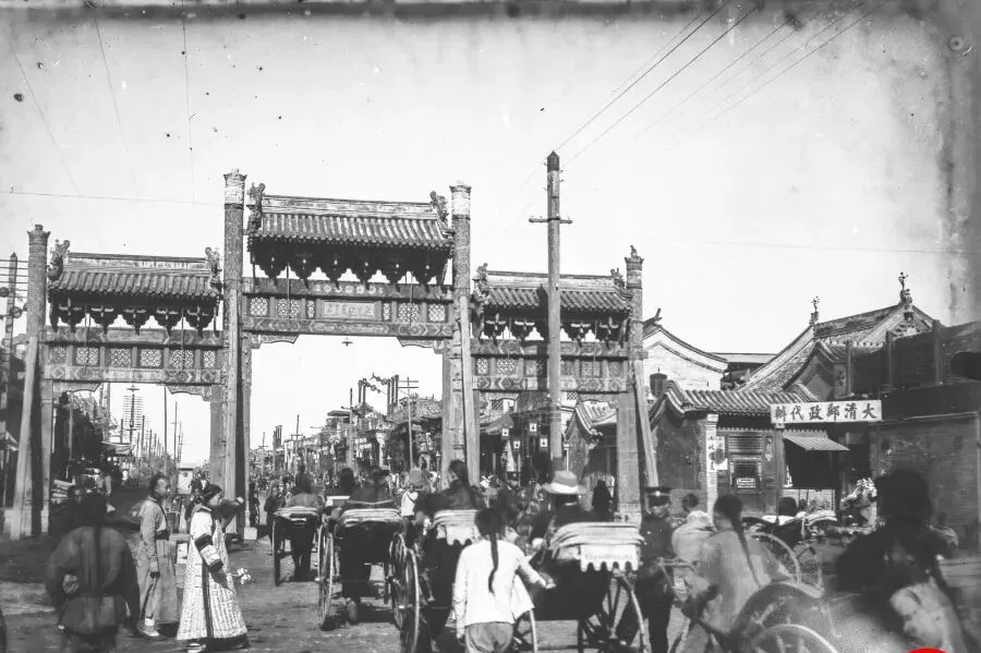 这个四柱三楼的大门叫牌楼,东四口子四面一座,檐下彩画重重,挑檐上挂着风铃,风一过叮叮当当,街心人力车往来,商号门脸密布,右侧牌子写着清代邮政代办,说明白了,寄件这活儿那时已经钻进胡同里了,我外公说过,过牌楼不能骑快,车夫得勒一把缰绳,怕磕了横梁下的吉字,图个口彩。