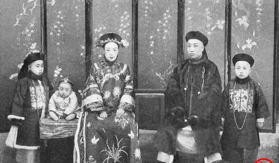 这个正式的合影叫贝子溥伦一家,屏风上画着花鸟,衣襟团寿滚边,孩子站两边,中间襁褓里还坐着个小小的娃,神情有点困,老照片的妙处就在这,一大家子坐得端端正正,偏偏小的要往边上扭头,像极了我们家过年拍照,妈妈在旁边小声嘀咕别动别动,结果快门按下去的时候,最小的总要眨眼睛。