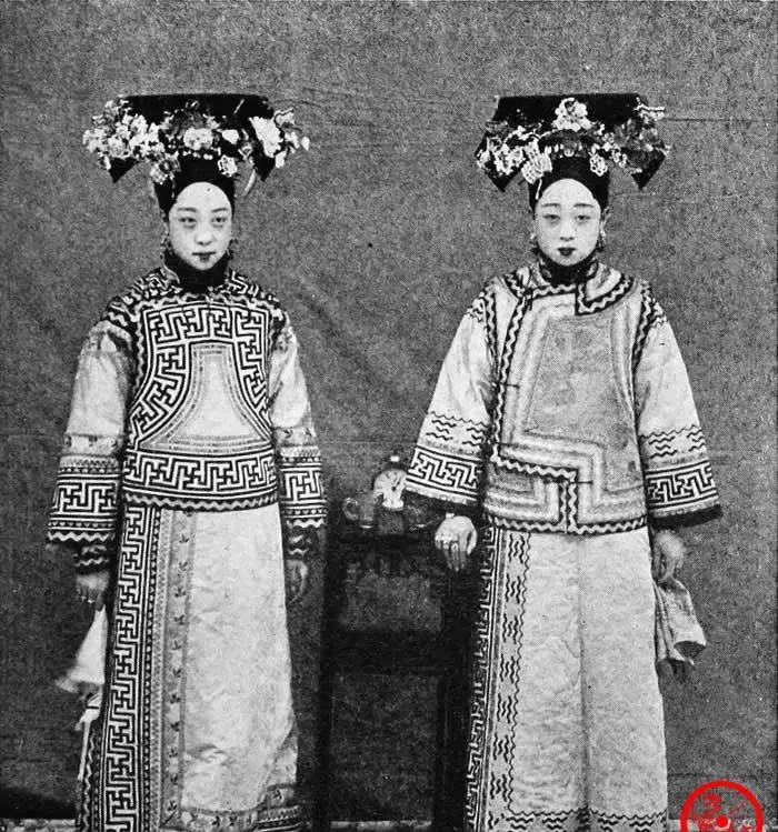 这对站着的姐妹花叫定郡王家的格格,一个衣襟上绣着回纹,一个领口缀滚边,头上花冠压得高高的,耳坠子往下垂着亮一下,小时候我第一次见清装戏,最先记住的就是这种发冠,妈妈说你别想着戴,沉得很,走两步脖子就酸了,现在拍照爱用滤镜加光晕,那会儿靠的就是实打实的首饰分量。