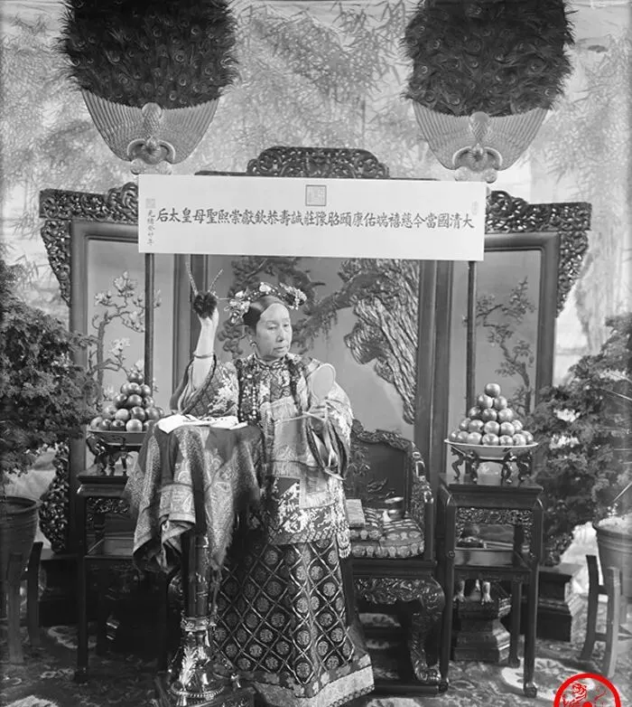 照片里台几上罩着锦缎,手里一面小圆镜,另一手举着梳子,身后两把巨大的孔雀翎撑起来,像两团云,边上堆着果盘和摆件,听档案里说这一场景一口气冲印了上百张,可见她自己中意,外人看是摆拍,我倒觉得像今日的化妆台自拍,只是把手机换成了铜镜,把滤镜交给了灯光和绣缎的反光。