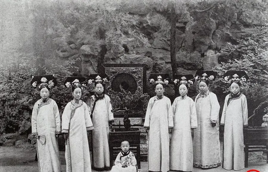 这个三人合影好认,头饰上压着大朵花,团扇和折扇各执一式,坐姿一模一样,鞋尖露在裙摆外,像被规矩量过的角度,侧福晋中有人后来生了载沣,往下又出了一个孩子后来进了宫,这一家子兴旺不兴旺,翻翻族谱就知道了。