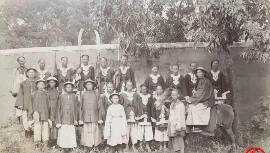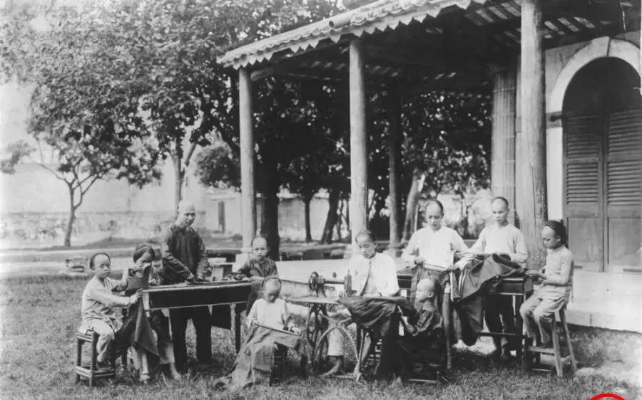 晚清老照片:男裁缝熟练使用缝纫机,亲兵手持青龙偃月刀保护官员。