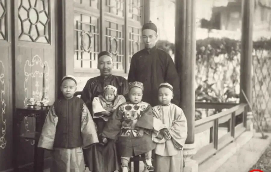 这个合影不用多说,就是全家福,爷们儿坐中间,小的穿着绣团纹的棉袍,帽顶一颗小绒球,背后窗棂是海棠纹,案上搁着一只青花小罐,笑意都藏在眼角里,奶奶说照相那会儿要憋住气,莫要眨眼,一家子端端正正地站好,等先生喊一声好了才散开,现在手机一顿连拍,挑片比拍照还久,以前一张就够传半辈子。