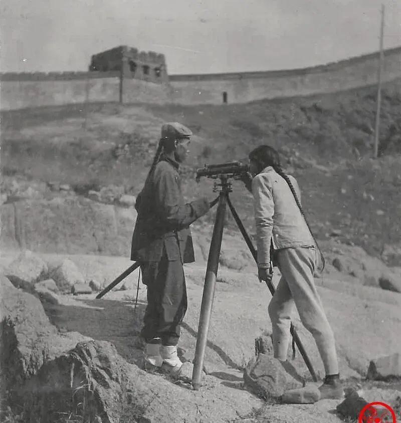 图中这台三脚架上的家伙叫经纬仪,旁边两位是京张铁路的测绘技术人员,木质脚架打着铁扣,仪器黑亮,刻度圈一格一格清清楚楚,山风一吹,衣襟飘起来,辫子也跟着摆,像是在配合读数的节奏。