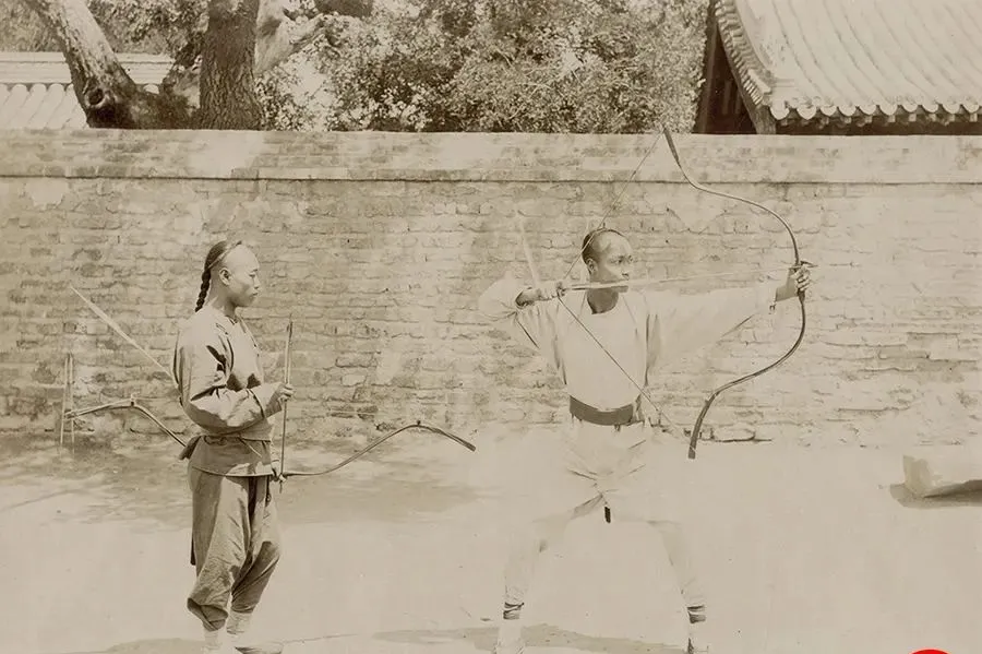 这个动作一看就知道,叫放大箭,清朝八旗子弟讲究这个,前面这位腰别两支羽箭,弓背厚实,握把鼓鼓的,脚下一扎马步,右手戴着扳指,气儿憋在胸口里不散。