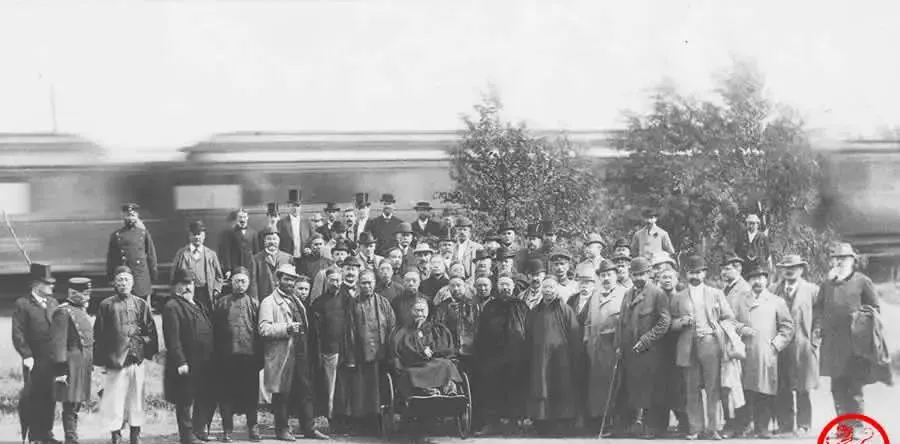 图中坐在轮椅上的这位是李鸿章,身边围着一大圈人,帽檐齐刷刷,后头火车影子一掠而过,轮椅铁框子油光发亮,靠手包着皮,脚踏板上摆得很稳。