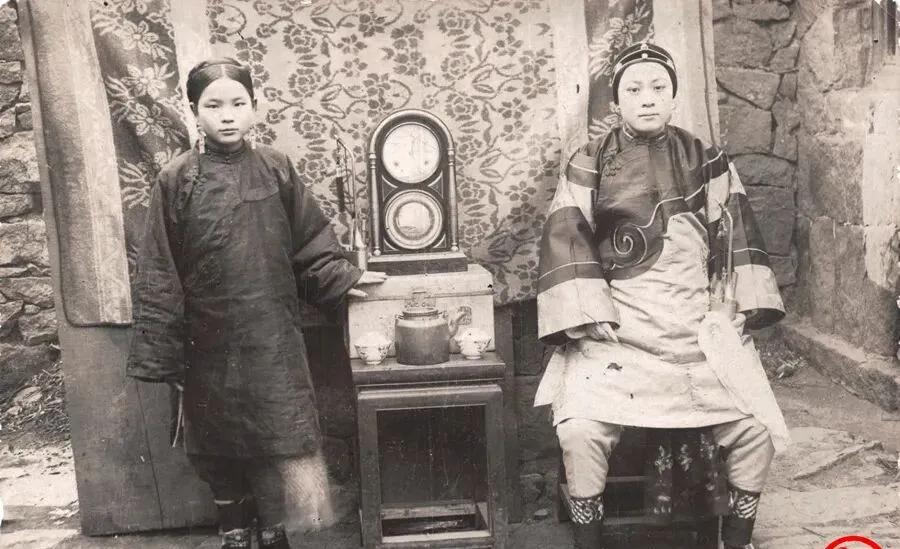这两位合在一张上的叫拼版照,都是闺阁打扮,前刘海剪得齐齐的,衣摆坠地,桌上摆花,旁边还故意放个钟表显阔气,脚下是小鞋,纤细得让人皱眉。