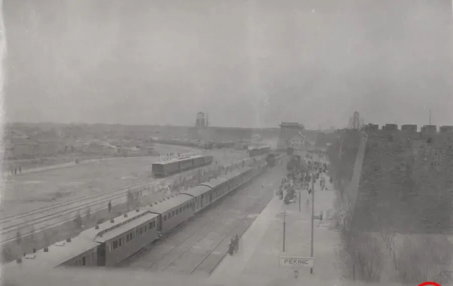 这个大场面是北京城墙旁的火车站,站牌上写着PEKING,月台细长,列车一节一节排开,远处有人群像蚂蚁一样密密麻麻,烟囱冒的白汽往北飘,城墙边的树只剩干枝,估摸着是深秋或是早春。