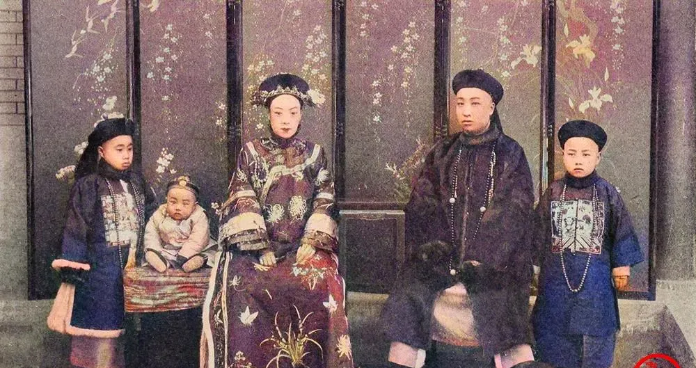 图中这套大红石青的衣裳叫朝服袍,缎面厚实,胸口补子一方,绣着走兽飞禽,绦带坠着玉捻子,男主人身上的朝珠一串串垂到胸前,孩子们的小蟒衣边沿缀粉色滚边,乍一看就知道是讲究人家,这类合影多在影楼屏风前拍,背后荷花海棠一屏,像把四季都折成了画带回家了。