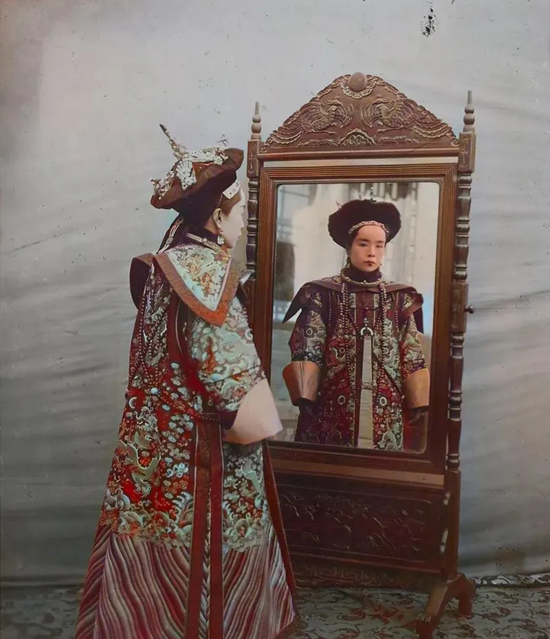 这个高个儿木架叫穿衣镜,雕龙刻凤,铜轴转得很顺,女子穿着蟒袍在镜前一站,正反三面都照了个遍,袖口里襻带压得服帖,披肩上细密的盘金线一拧一拧发亮,妈妈看见这张说,做活儿的人才知道,一件绣到齐活得熬几盏灯,针脚落得密才能经得住镜头。