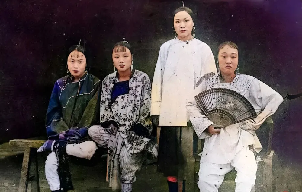 这张里左边小脚裹得尖尖,右边天足穿男装长衫,桌上搁着鼻烟壶和折页册子,姿态一柔一倔,像把一个时代掰成了两半,以前讲规矩讲门第,现在讲方便讲自个儿舒坦,一进一退之间,就是人心的转向。