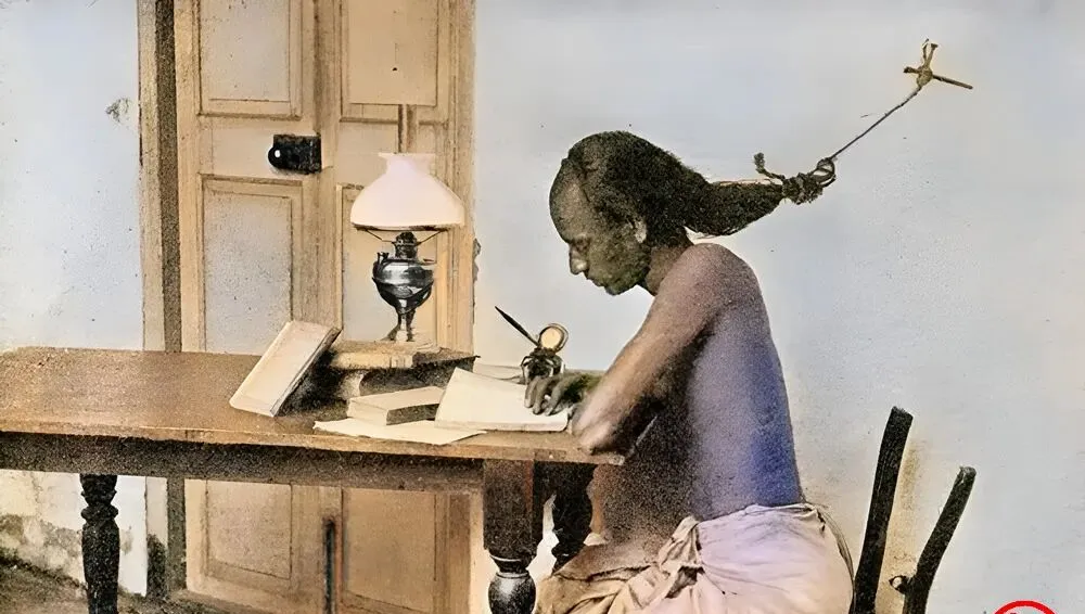 这个动作叫头悬梁,辫梢系在梁上,前头一支细竹钩,写字打瞌睡时一沉,就被扯得生疼,人立马清醒,桌上煤油灯映着纸面发黄,几本四书五经摞着压角,为科举这口气儿,多少年轻人把夜熬成了白,那会儿没有老师一节节讲,只能自个儿啃。