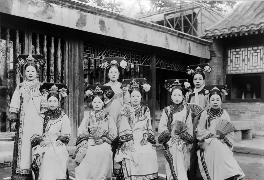 图中这些穿大襟朝服的女士叫皇族女眷,衣料多是缎与绫,发上压着宽大的福晋头,簪花坠玉一排排闪着冷光,衣缘滚海水江崖与如意云头,规矩摆着,脸上却不全是笑,像是告诉我们那个阶层的礼法比风还重,走路都得掂着脚尖。