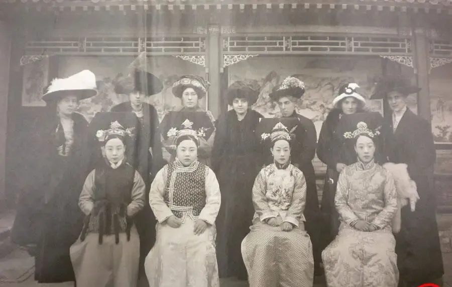 这个合影叫“中外同框”,前排的旗装一列,后排的西式宽檐帽一列,两个世界挤在同一张底片里,帽檐像云,旗头像山,彼此打量的眼神能从纸上窜出来,奶奶看过说,当年城里人见着老外都好奇,现在我们坐地铁刷手机,谁还抬头看谁。