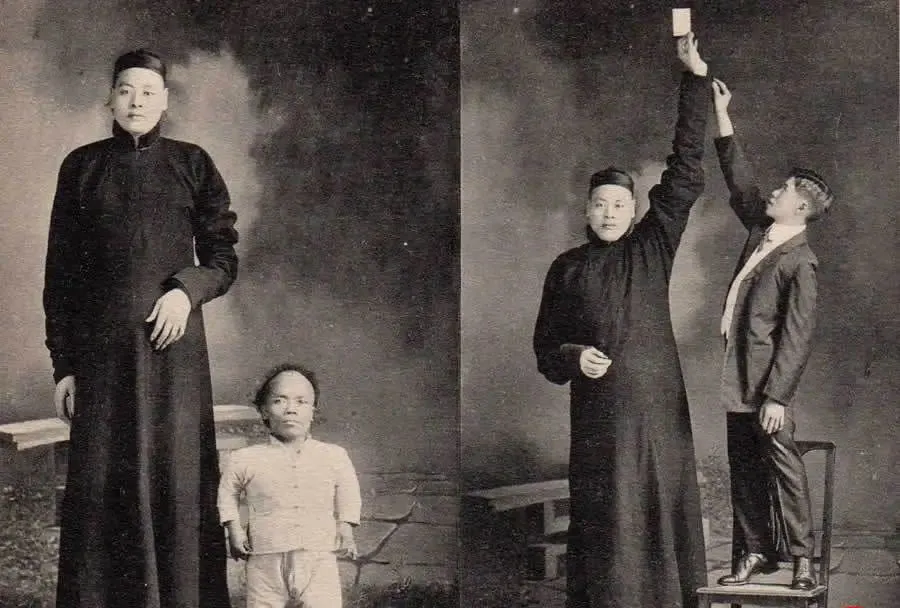 这个高个子叫舞台巨人,站在摄影棚里穿一身黑长衫,袖口垂到手背,旁边配了个侏儒与一个踩椅子的外国小伙,构图挺坏心思的,硬把身高差当噱头,巨人抬手举卡片,另一人踮脚也够不着,镜头外大概有人起哄,热闹过后他收回胳膊,衣袖里只有静。