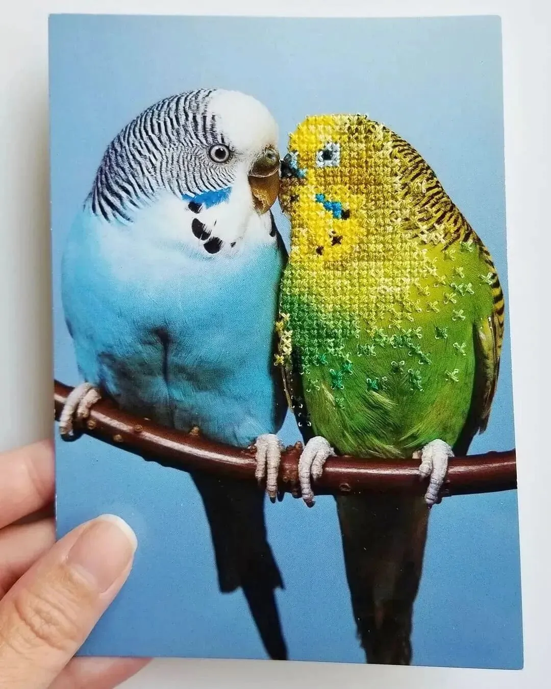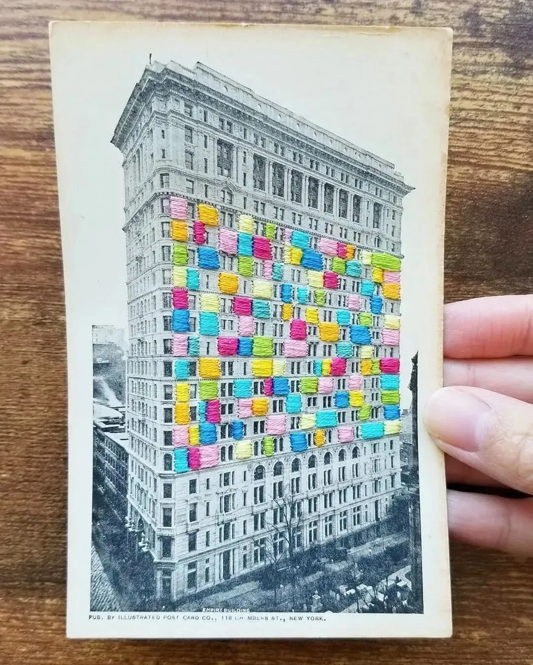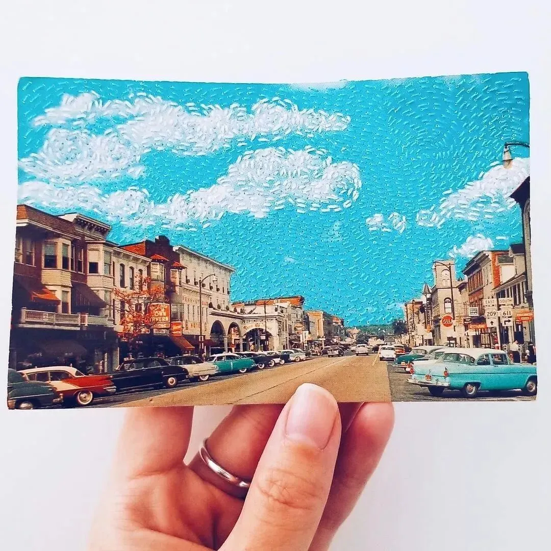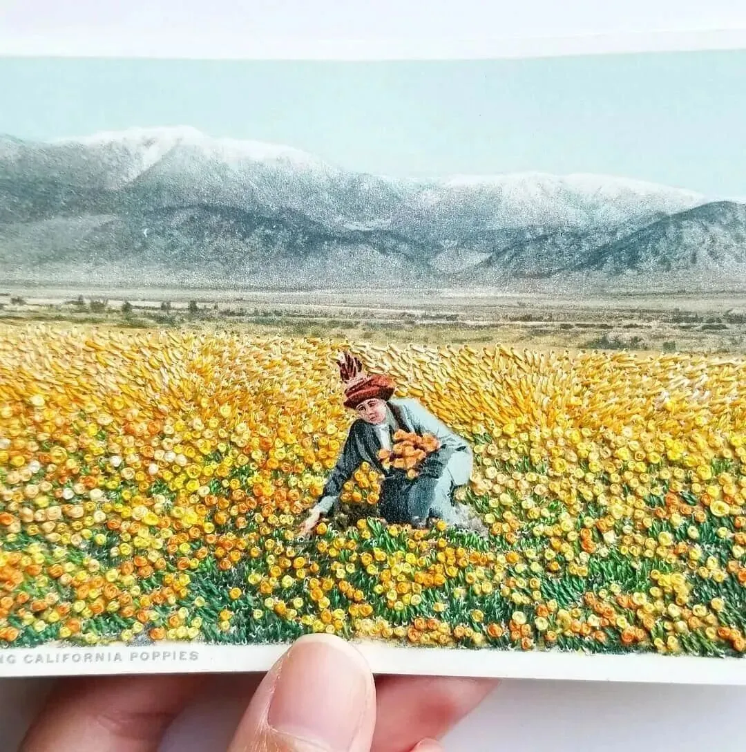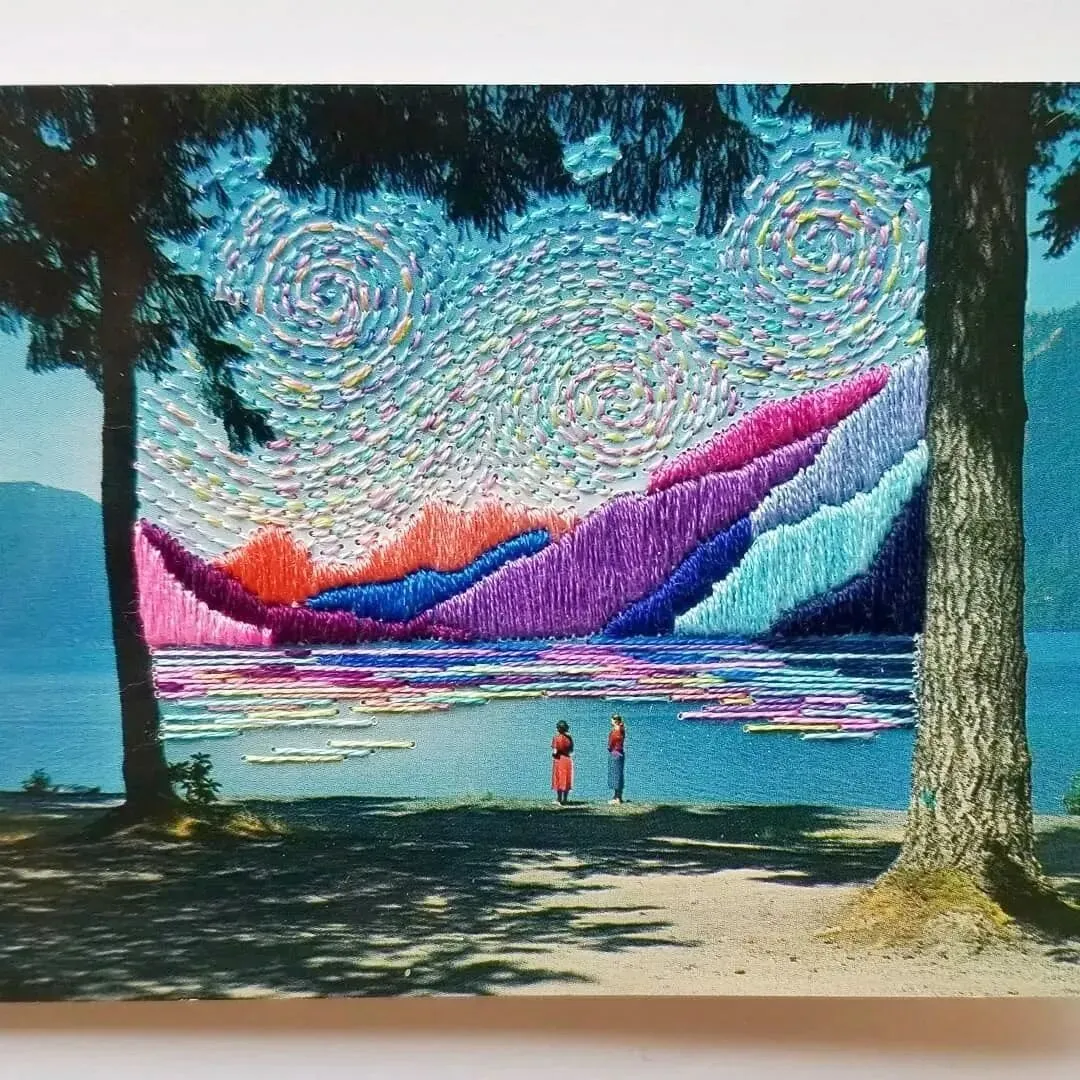 她用细密的针脚,在明信片的天空、山峦和湖面上绣出漩涡状的图案,仿佛是梵高《星月夜》的现实版。