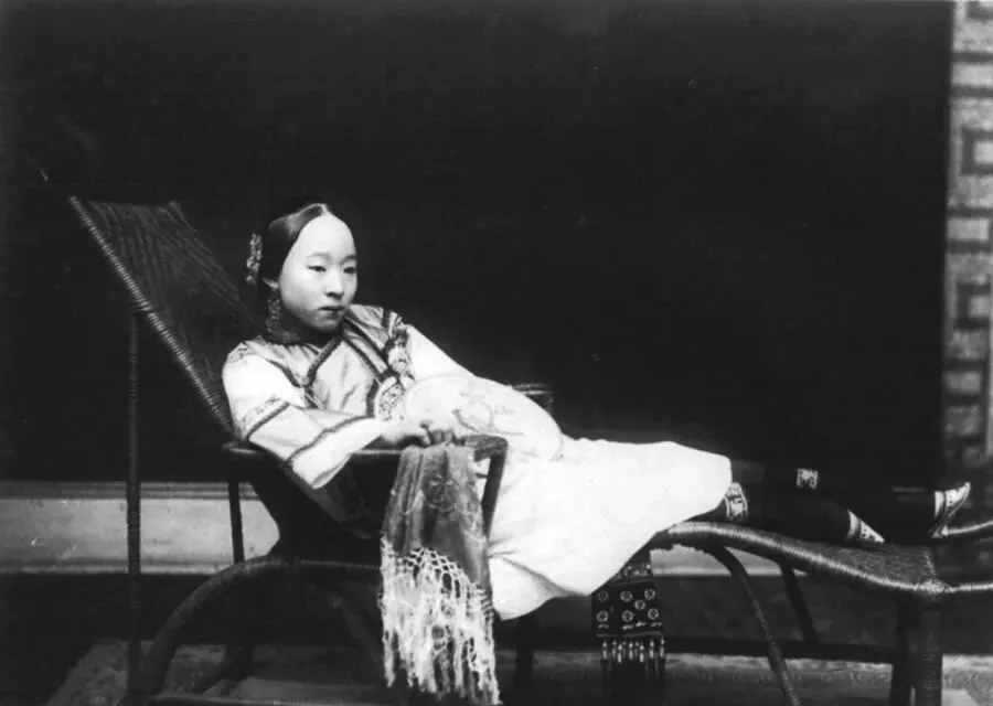 图中这把藤编躺椅最识货,细藤密织,椅面微微弹手,女子靠在上头握着团扇,膝上搭着流苏手绢,脚边露出一双细小尖头鞋,鞋面绣花密密,走起路来轻得像不沾地,外人看着体面,神情却有些落空,妈妈看见这张照片只说了一句,漂亮是漂亮,受的罪也是真不轻,现在我们讲舒适讲自如,那会儿讲的是礼法与规矩,味儿不一样。
