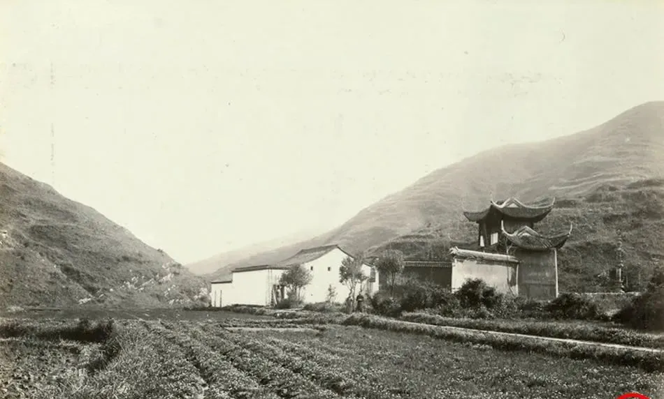 这张在山坳里的是虎跑寺的旧影,白墙黑瓦缩在两道山背之间,旁边突起一角亭,屋檐像虎耳,田畴在前,垄沟清清楚楚,僧房门口没人,静得能听到脚下泥土冒泡,后来寺庙毁而复起,水还在