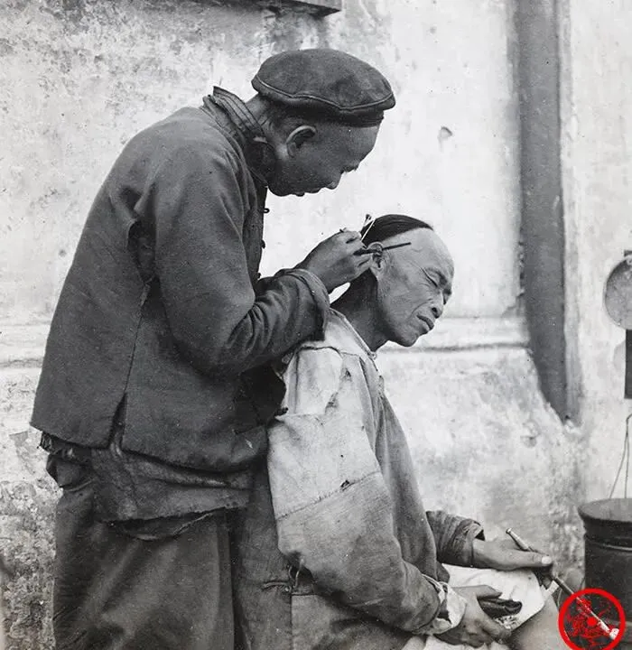 图中架着小凳子的活计叫采耳,剃头匠顺带干的门艺,用的是一套细长的金属小勺小刷小簧片,亮汪汪的,末端挂根细线,挑着拂着,耳边像有小羽毛挠过一样酥麻,坐的人偏头闭眼,手里还攥着烟袋,轻松得不行,老城根儿下常见这一幕,以前街口喊声一嗓子就来人,现在理发店里也有,可规矩和味道都淡了。