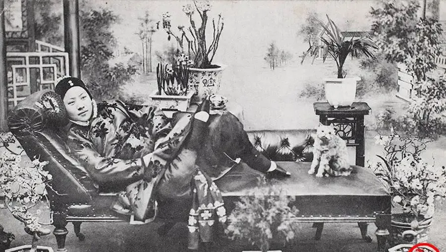 这张姿态张扬,女子倚在躺榻上,锦缎里子反着光,小帽上别着圆润的饰扣,脚尖翘得高,硬硬的小弓鞋包着,那时叫三寸金莲,她侧脸抿笑,像刻意让人看见这双脚,家里老人说,缠脚痛不痛,她们不说,走起路来一步一颤是事实,过去觉得这是美,现在说是病,观念就这么倒了个个儿。
