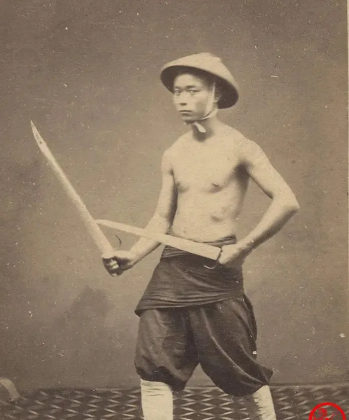 图中这个光着上身的年轻人叫清军步勇,手里一对木柄长刀,刀身细长像两根灰亮的柳叶,腰间围着深色短裙,腿上裹白绑腿,头顶是一顶草编凉帽,边缘翻得利索,整个人清瘦得很,却把架势摆得很正,眼神是硬的,肌肉却不见几两肉,这种反差,在那会儿算常见景儿,爷爷说,当年乡兵拉起来快,练起来慢,真要对阵洋枪洋炮,靠这两把刀,胆子顶天,器械不顶用。