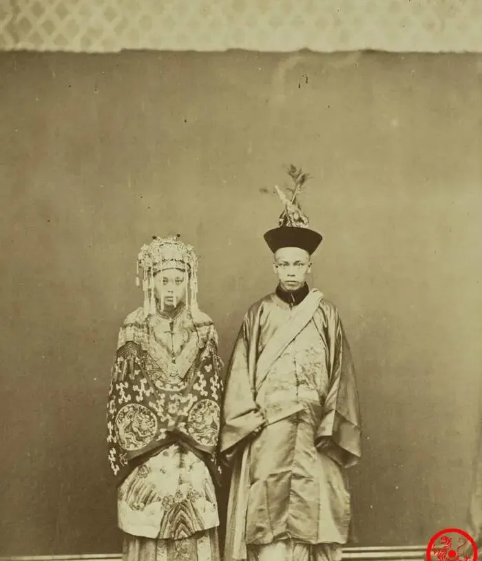 晚清老照片:新婚夫妻盛装合影很罕见,妇女穿铠甲模样滑稽。