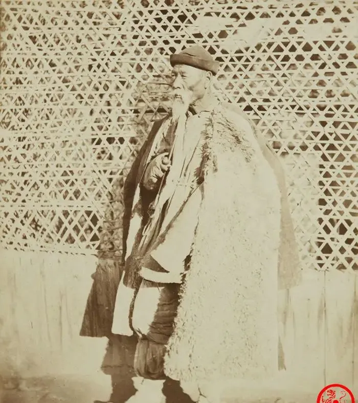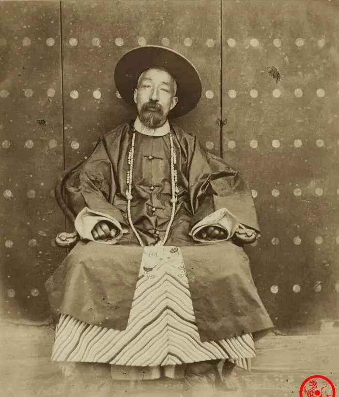 这个老先生叫本堂官,夏季朝服搭着,胸前一串朝珠沉沉垂下,袖口大得能兜两把扇子,帽檐宽,阴影把眼窝压得更深,他微微侧着,像是从案牍里刚抬头,门钉作背景,圆圆一片一片数不过来,外头正是暑天,他的脸却不出汗,规矩摆在身上,热也得忍,外公说,以前一顶帽子就知道谁是官谁是民,现在谁谁都戴棒球帽,标识变了,章法也变了。