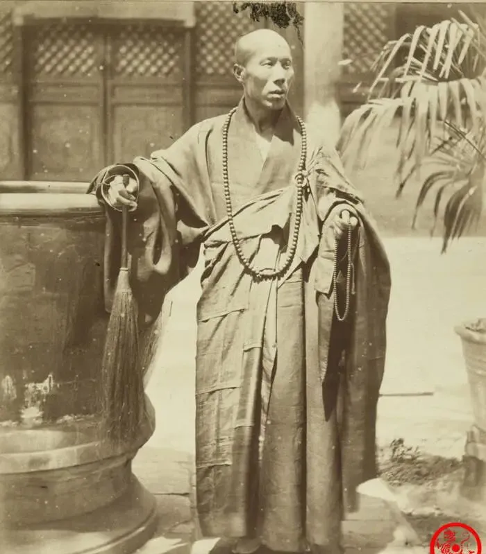 这个法器叫拂尘,手柄木色温润,穗子垂下来像雨丝,他右手提着,左手持念珠,袈裟一层又一层披着,脚边的大铜缸映出一点光斑,院子里种着棕榈,影子落在墙上,安静得很,我小时候在寺里玩过,师父笑说,拂尘本来就是赶苍蝇的,现在拿来拂烦恼,至于有没有用,心里若不乱,什么都能当拂尘。