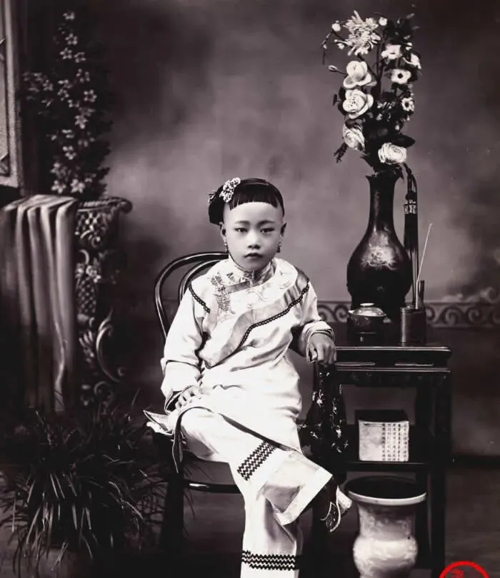 图中小小年纪的闺女叫千金小姐,绸缎旗装亮得能照人,袖口边一圈一圈细绣,发边斜插一支花,桌上铜胎花瓶鼓着肚子,边上摆着墨盒纸鎗,都是讲究,最扎眼的还是那双小脚,尖尖翘着像把月牙,妈妈看着照片就嘟囔,这样裹着走一步疼一步,叫时尚也真是苦时尚,不过那会儿就认这个,谁家姑娘裹得小,谁就体面。