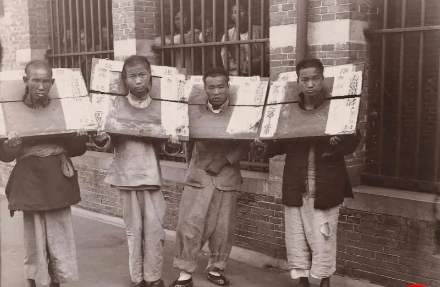 这个木框架叫枷锁,四个青年卡着脖项站墙根,板上糊着纸写着罪由,旁边铁栏杆冷不丁扎眼,师父以前讲过,会审公廨里中外一桌坐着断案,定了再押进巡捕房,想想现在派出所里电子屏一亮就登记,那时候就是一块板子一张纸,当街示众,脸面比刑还重。