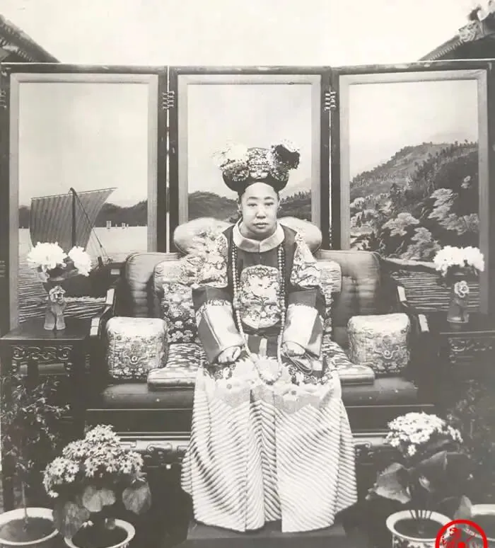 图中这位是瑾妃,这个造型叫大礼服坐像,绣面厚实的龙纹补子压得肩膀微微发紧,头顶的大拉翅簪花层层叠叠,黑亮的缎面把脸衬得更白,身旁摆屏画着山水和帆船,像是把江南景致搬到室内,老照片里她神情不多,却透着一股不容忽视的威严,听老先生讲,影楼里拍这种坐像规矩多得很,手要压住衣襟,脚尖并拢不能乱动,拍完一身汗也得稳住气场。