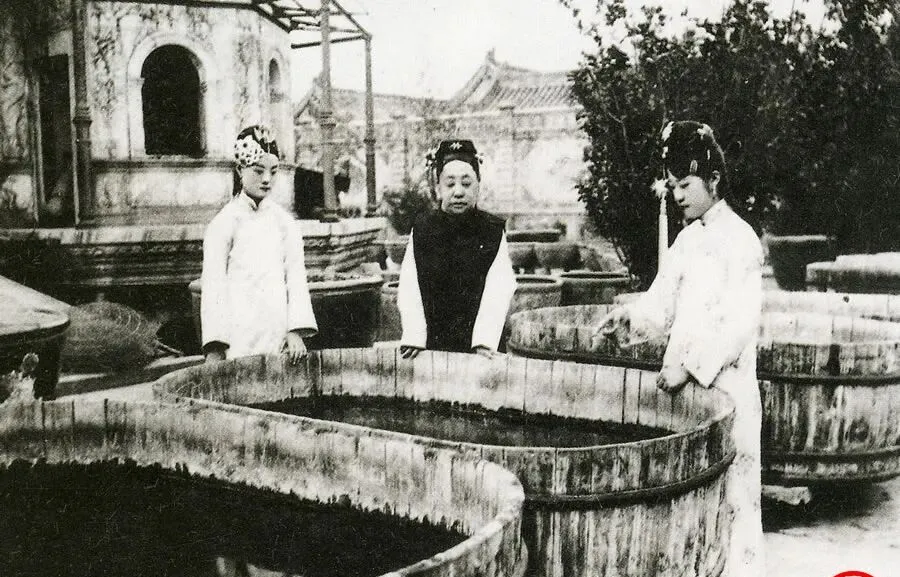 这个场景叫看鱼盆,几口大木缸撑在院里,木板圈出椭圆的口,边沿打着铁箍,瑾妃站中间,左右各一名宫女托着袖口往水里探看,夏天里这种消暑法子最见功夫,水面一动,金鳞一闪,她就会吩咐再添几捧井水降温,奶奶说她小的时候院里也摆过木缸,午后晒得发烫,往里撒一把槐花,香气顺着水汽往上冒,现在我们吹空调看短视频,早把这份慢悠悠的讲究给丢了。