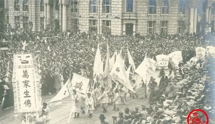 说回这场面为什么大,照片里已经给了答案,官衔铺满旌面,执事多到数不清,和尚道士一片花纹翻飞,乐队分散在前后打点节奏,队伍能拉出去五里地,上海滩的街面就这么被封成一条灰色长河,报上说看客几乎无处落脚,这话一点不夸张。