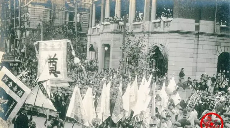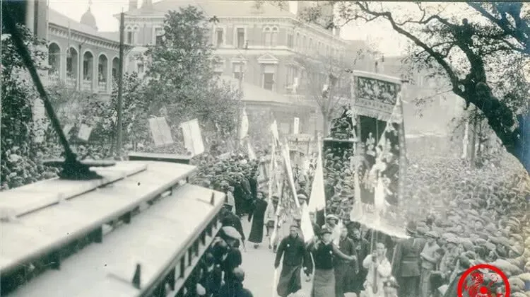 这个路口场景最热闹,黑压压全是人,旗子插在中间像林子,照片左边有电车车顶,说明那会儿租界电车已经跑起来了,旧与新就这么搅在一处,孩子们扒着树干往里看,大人站着踮脚,谁也不想错过头牌,放到现在你说是大型直播现场吧,味儿还真像。