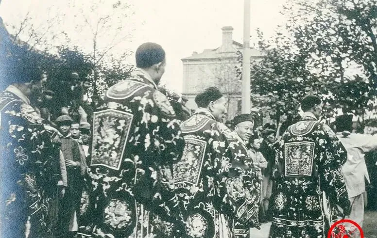 这一身厚重的黑底彩绣礼服,后背一整块绣蟒,金线压着盘,肩头花团滚滚,腰间束带藏在里头,转身的时候绣片一摆,像活的,穿这衣裳的多半是执礼人员或前清卫队出来的角色,站姿直,脚跟合得紧,动作都对着一个口令走,讲的是队形齐整的面子。