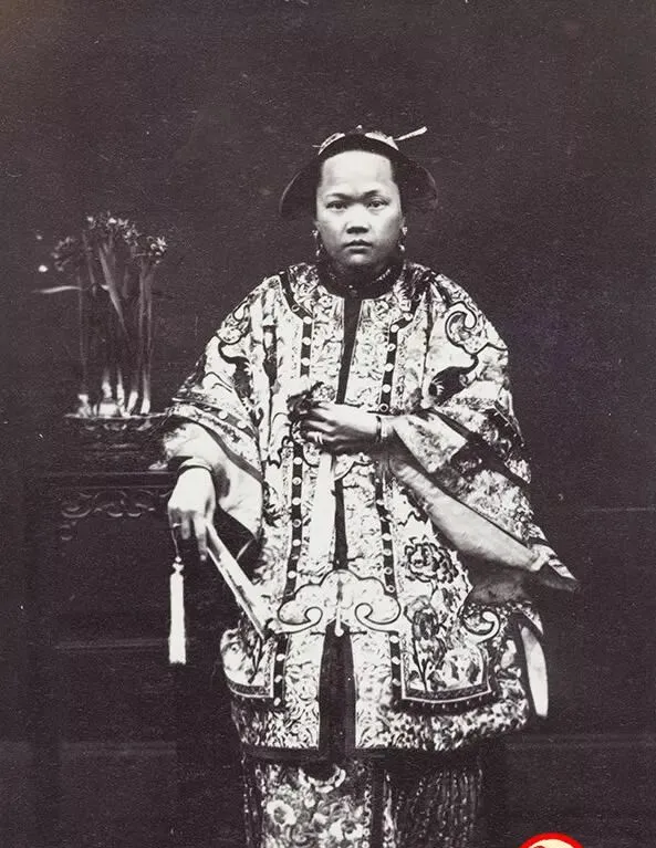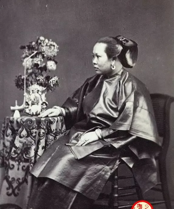 这个角度好玩,贵妇侧坐,身后发髻像一只包子,乌得发亮,桌围压得服帖,花几上摆小像与花团,手边似有一支细细的烟杆,嘴角含着一点不耐烦的劲儿,像在等掌柜把背景布理顺,摄影师多半喊了一声好,就按下快门,那一下子可不是咔嚓,是闷闷的一声,像捶在木箱里。