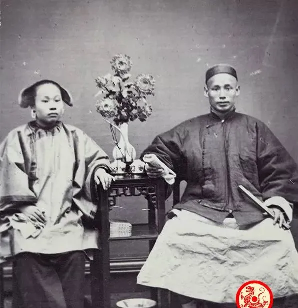 这对是成双入镜的夫妻照,木几上是瓷瓶与茶盅,男的手里挟扇,女的压着袍袖,镜头里留出的空位正好把花插在两人之间,像个褂穗一样把日子拢住,小时候我家还留着一张祖辈的双人照,也是这么摆,中间一盆花,左右各坐一人,谁也不抢谁的锋头。