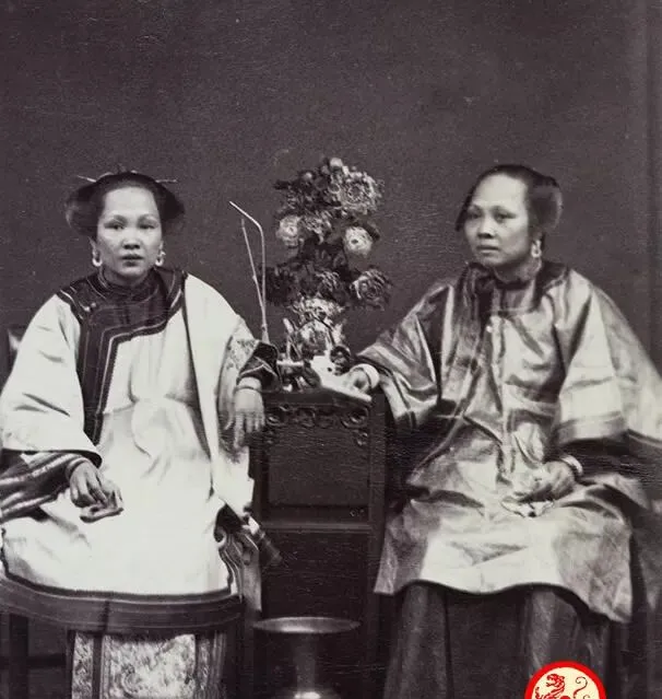 这两位的发髻一个高一个低,耳坠一个环一个坠,桌上又是细长的水烟袋,瓶花团成一球,衣料薄厚有别,左边那位的领口滚了暗纹的边,右边这位的袍面更亮些,像新打的漆,一家人围着看照片时,姥姥笑着指点,说这烟袋杆儿可长,年轻时候也学着吸过一口,呛得直掉泪,不像现在人手一根电子棒。