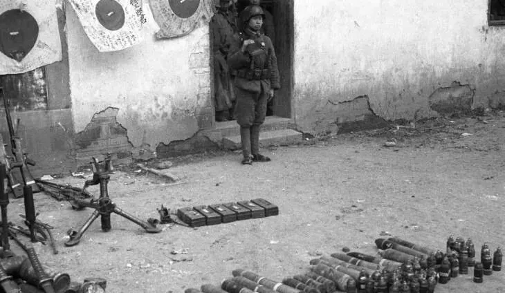 图中这摊子手榴弹和机枪脚架叫战利品堆场,泥地上排得直直当当,弹匣像黑砖头一块块码齐,墙皮剥落的屋檐下立着个小个子国军士兵,背上绑着刺刀,手指勾着枪背带,神情紧着不放松,爷爷说那会儿看堆场要打起十二分精神,别看停火一阵子,走火走弹的事照样能出,放在现在咯,这样的摆拍谁还敢这么靠近实弹呢。
