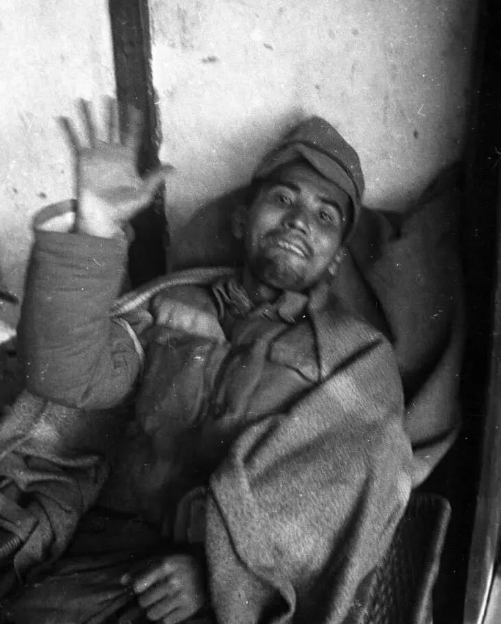 这个躺着摆手的家伙是被俘的日军兵,脸上挂着怪里怪气的笑,手掌抬得老高,像跟镜头招呼,又像逞强,奶奶当年听广播时就说,有的人被捉了嘴上还硬,肚里却虚得很,现在看着也就那样一股子虚火,镜头一按就全露出来了。