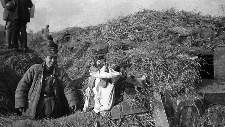 这坨土包是草覆工事,草绳压着泥面,洞口黑得看不见底,旁边士兵笑着举起一串缴来的零碎,军帽压得低低的,袖口磨起毛来,手里的木箱边角被雨打起刺,工事这种东西,远看像土窝,近看一身刺,猫着腰钻进去,肩膀就能听见泥土的呼吸,可惜现在多半只在史书里翻得到。