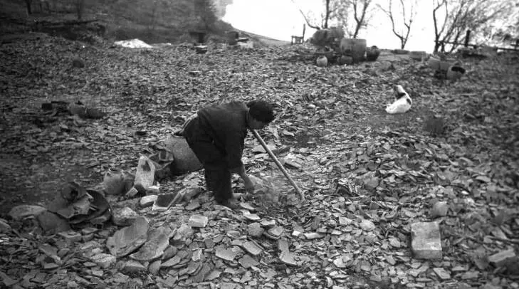 这个弯腰抡耙的叫拾荒汉,脚下全是碎陶片,阳光一照像撒了一地鱼鳞,动作一点不慢,耙头叮叮当当地敲出脆响,外婆说战后先活下去再谈别的,能刨出一只完口碗就算赚了,放在今天,谁还会在废墟里找锅找碗呢。
