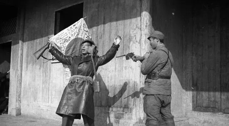 这张很有趣,图中扯着旗子的男的在重演活捉日本兵的情景,胳膊高举,背上挂着弹带,皮大衣反着油光,另一边的士兵举枪配合,像给记者摆了个利落的造型,别嫌矫情,那时候镜头少,拍一回能鼓一回气,战士自己也要看见自己能赢,这股子气儿比啥都金贵。