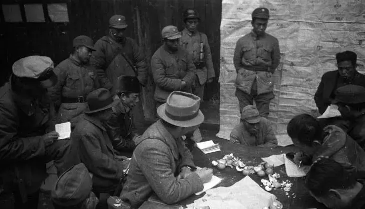 这堆人围着长桌子的是采访登记场景,纸堆成小山,钢笔往纸上蹭蹭响,帽檐压影把脸切成两半,墙上糊着大幅地图,墨线弯来绕去,像河道,记者低声追问,士兵抬眼想一想再点头,信息得慢慢捞,急不得,现在我们敲键盘两下就能发出去,那会儿一张纸就是一条命脉,写错一笔都心惊。