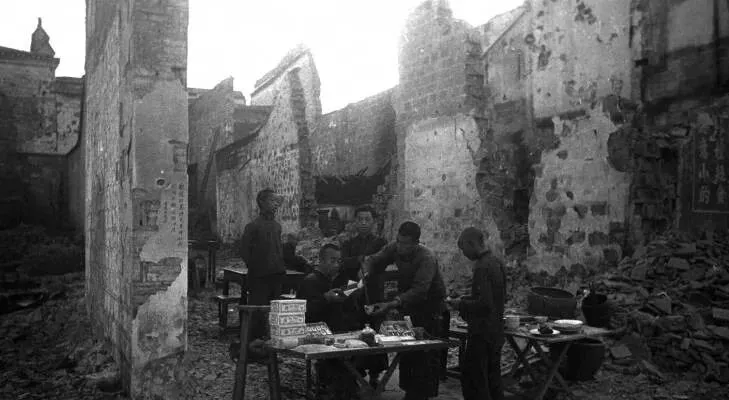图里的瓦片坡坡叫废墟场,墙洞像被火咬过一圈,土砖里冒着亮白的石灰茬子,两三个孩子踏着影子在缝隙里跳,小时候我家院后也有一堵塌墙,风一刮沙子打脸生疼,那时候的常德更狠,风里混着焦糊味和潮土味,这味道你闻一次就忘不了。