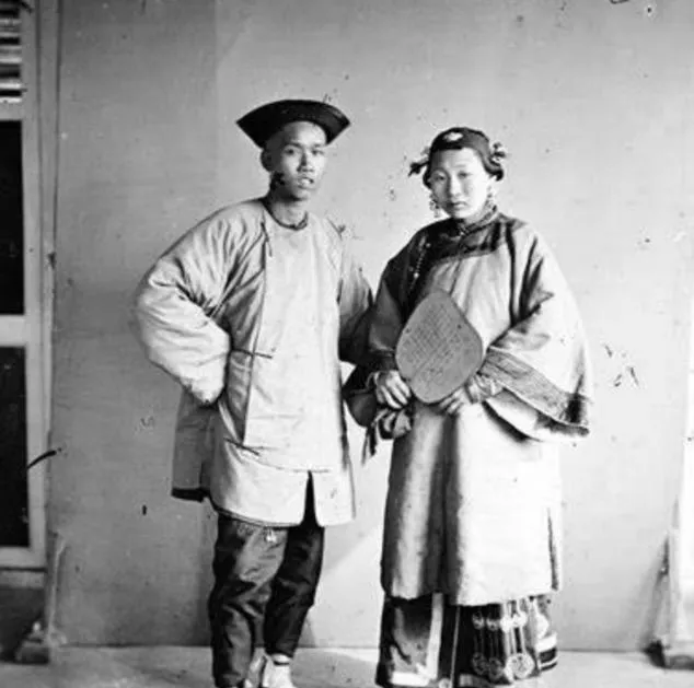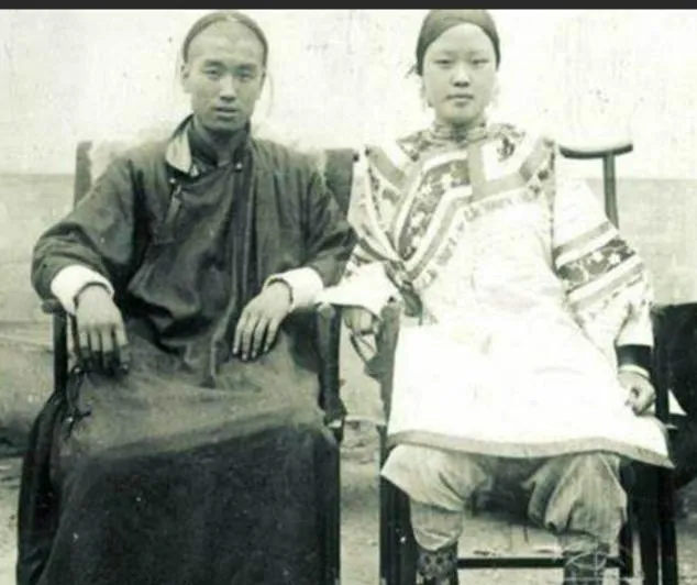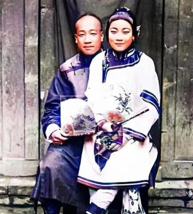 这个看着有点别扭的姿势叫坐膝拍,女子裹着小脚,绣花云头鞋尖尖的,衣摆堆在男的膝上,男的揽得紧,笑得有点得意,这在那会儿算挺放得开的了,奶奶看过直摇头,说那时候讲究夫为妻纲,可你看,人心里那点亲热劲儿还是藏不住的。