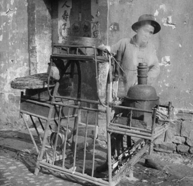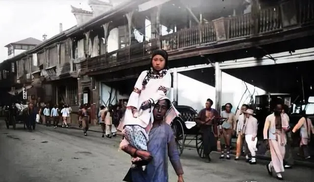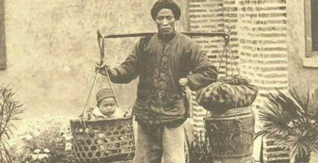 图里的姿势我们那儿叫扛娃,木质扁担角度压得低,孩子坐在肩头,穿着夹袄不吭声,后面是一排半塌的骑楼,风一过,灰尘打着转儿,小时候我爸说起这阵仗就笑,穷归穷,能把娃带在身上,心里踏实。