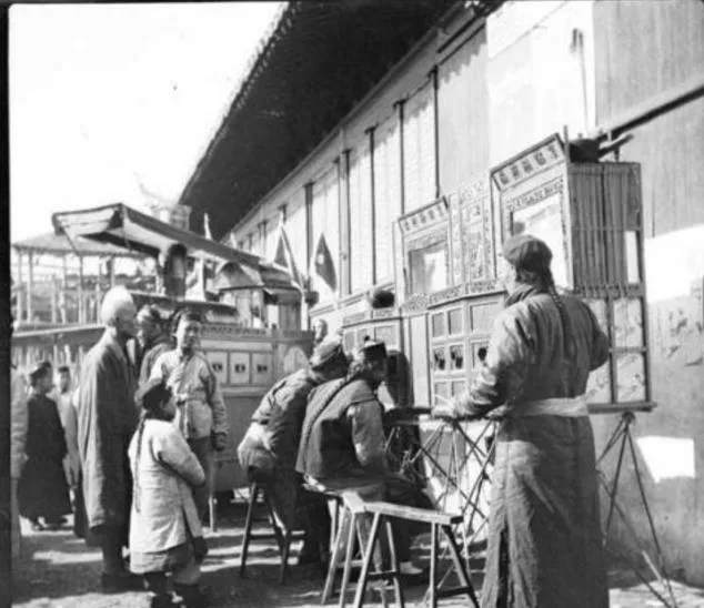 这个摊叫拉洋片,木箱一格一格,彩画亮得扎眼,伙计一边摇铃一边喊,看一眼一个铜板,孩子趴着小窗不肯走,大人袖子里摸摸钱,犹豫两下也就掏了。