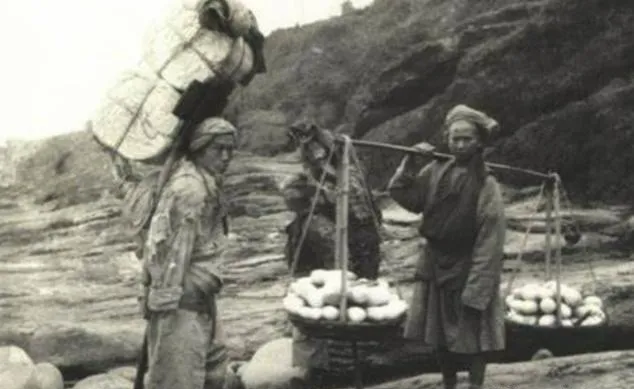 图中这挑子一头是白生生的饼子,一头是杂货,扁担压在肩窝里,额头系条破布巾,那条路石头多,脚一滑,整担就跟着歪,同行的抬手一扶,口里嘟囔一句走稳点。